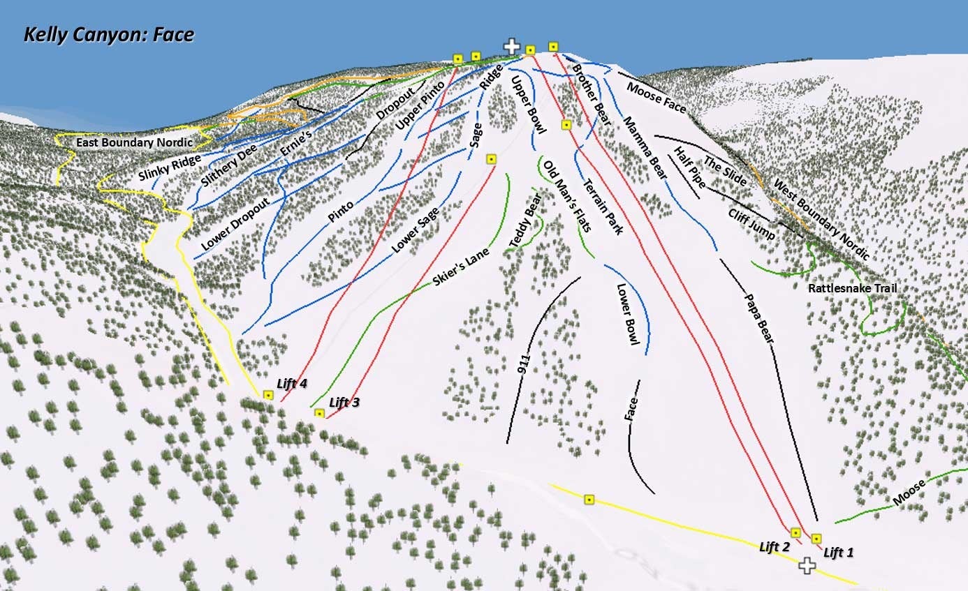 Spoznajte lyžiarske stredisko Kelly Canyon Ski Area - pozrite si, ako vyzerá mapa strediska Kelly Canyon Ski Area, naplánujte si lyžovačku na ďalší deň alebo si znova pripomeňte zjazdovky, ktoré ste už na lyžiach prešli. Kliknutím na mapu nižšie sa náhľad zväčší