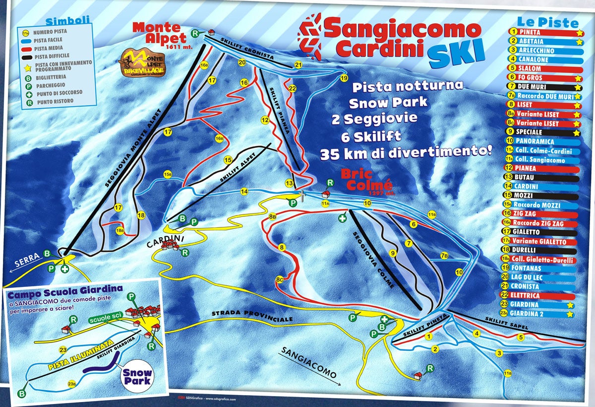 Spoznajte lyžiarske stredisko Sangiacomo di Roburent - pozrite si, ako vyzerá mapa strediska Sangiacomo di Roburent, naplánujte si lyžovačku na ďalší deň alebo si znova pripomeňte zjazdovky, ktoré ste už na lyžiach prešli. Kliknutím na mapu nižšie sa náhľad zväčší