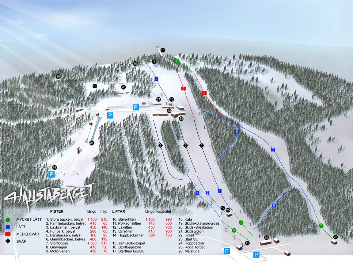 Spoznajte lyžiarske stredisko Hallstabackarna - Hallstaberget - pozrite si, ako vyzerá mapa strediska Hallstabackarna - Hallstaberget, naplánujte si lyžovačku na ďalší deň alebo si znova pripomeňte zjazdovky, ktoré ste už na lyžiach prešli. Kliknutím na mapu nižšie sa náhľad zväčší