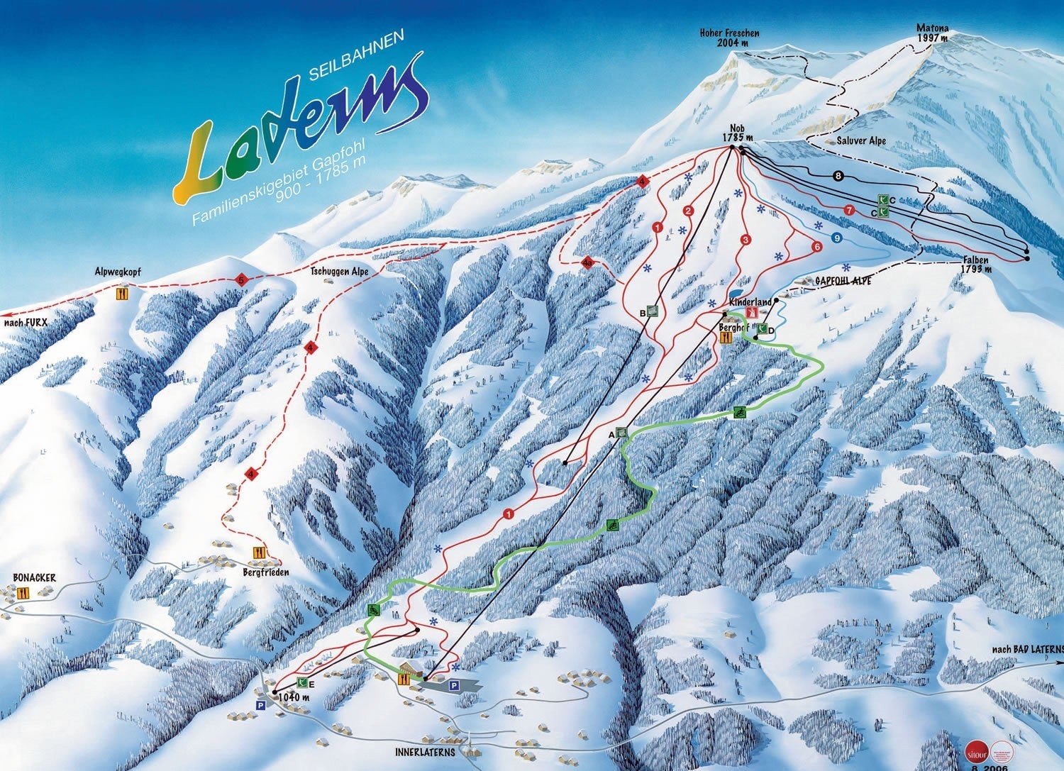 Spoznajte lyžiarske stredisko Laterns - Gapfohl - pozrite si, ako vyzerá mapa strediska Laterns - Gapfohl, naplánujte si lyžovačku na ďalší deň alebo si znova pripomeňte zjazdovky, ktoré ste už na lyžiach prešli. Kliknutím na mapu nižšie sa náhľad zväčší